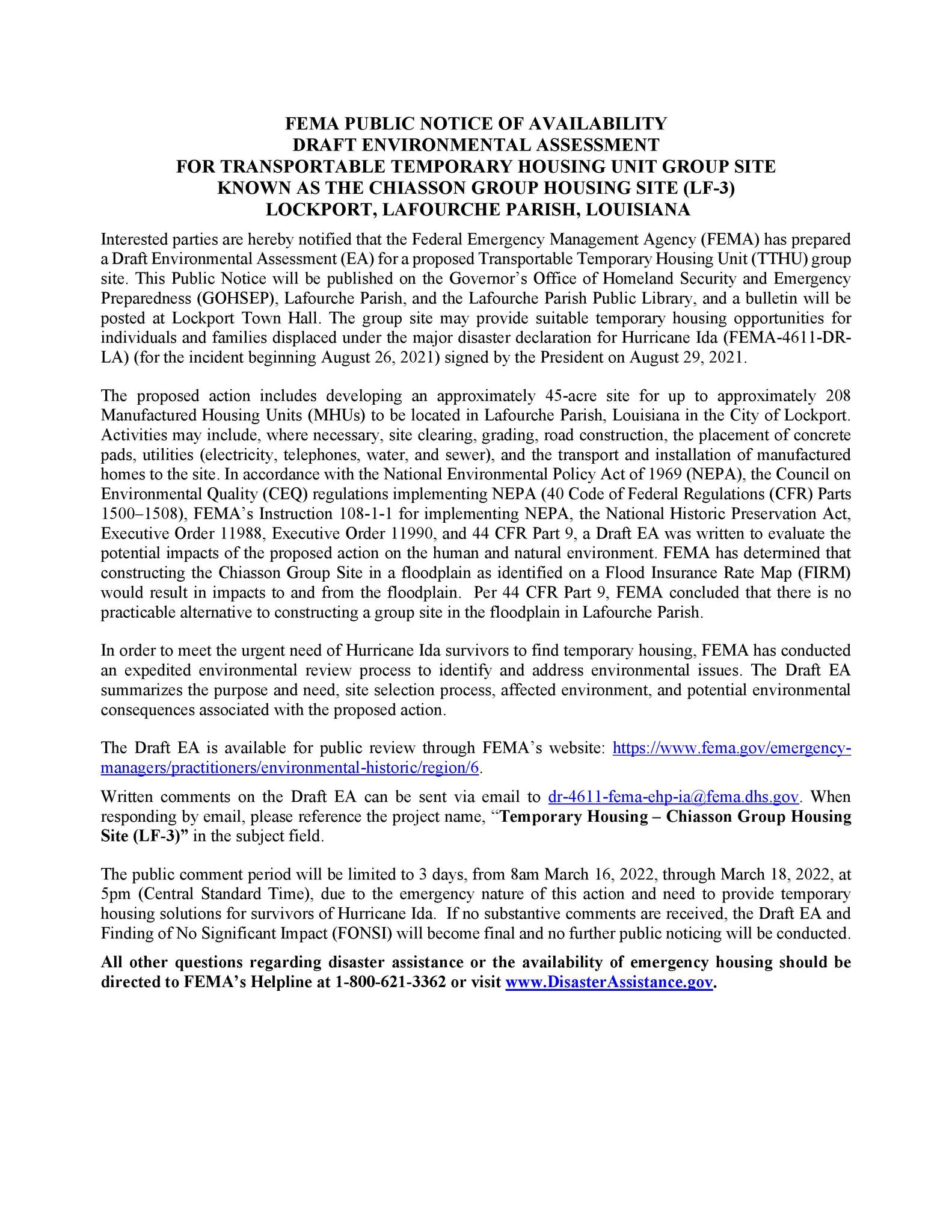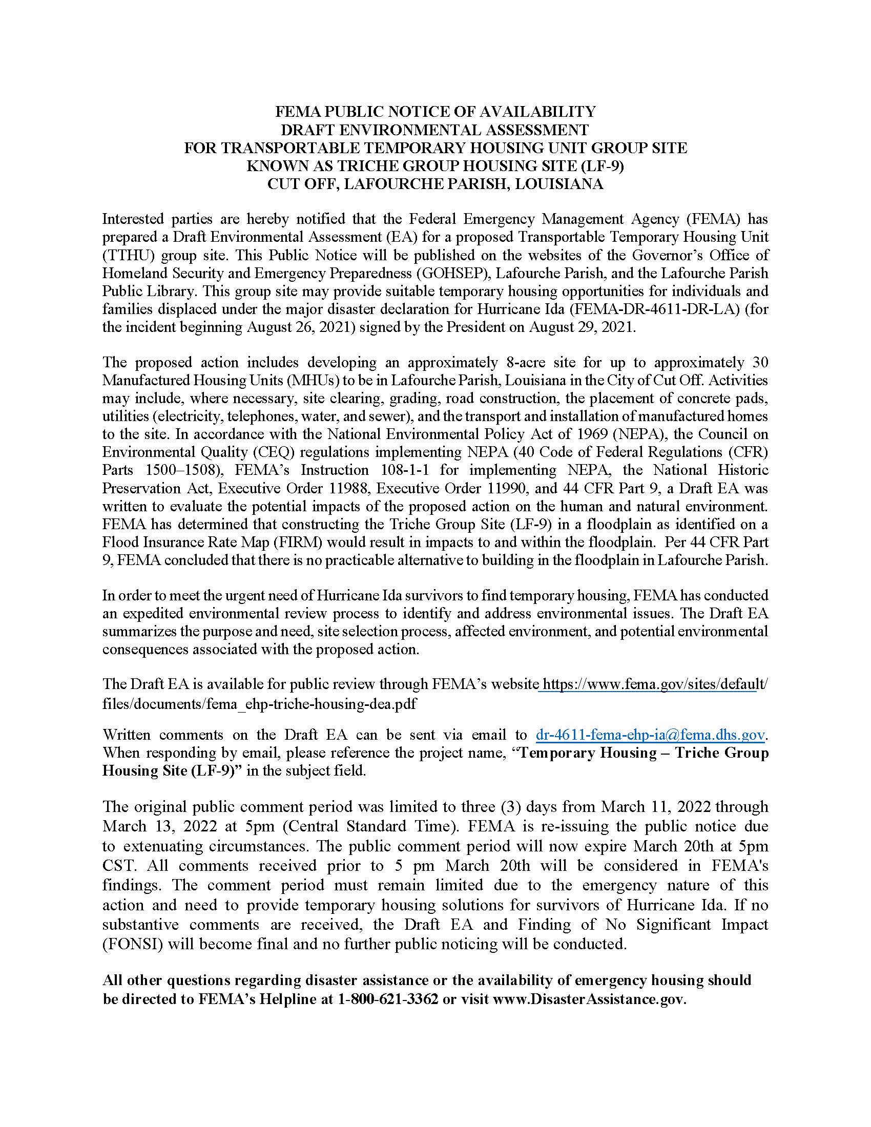 FEMA Public Notice for Public Comment for Temporary Housing Known as Triche Group Housing Site